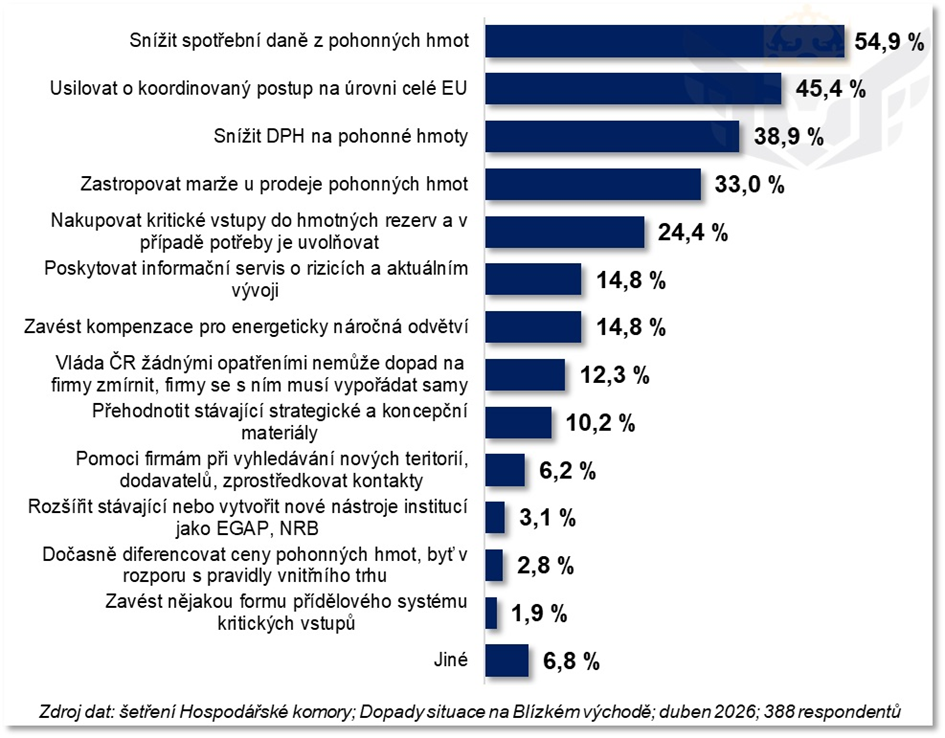 Eskalace napětí na Blízkém východě se negativně promítla do podnikání. V bleskovém šetření Hospodářské komory firmy nejčastěji zmiňují růst cen energetických vstupů a pohonných hmot (72,5 % respondentů) a zdražování materiálů a komponent (54,3 % respondentů). Vláda podle do šetření zapojených podnikatelů zvolila v reakci na situaci kroky správným směrem. Podnikatelé zároveň očekávají další cílená opatření pro podporu investičního apetitu.