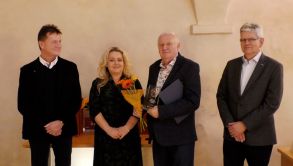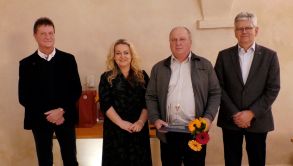 Na fotografii (zleva): předseda Oblastní kanceláře Jhk v Prachaticích Václav Franz, Kateřina Třísková - ředitelka ObHK Prachatice, Stanislav Marek - jednatel oceněné společnosti BETON Těšovice s.r.o. a živnostník roku Jan Kafka, Luděk Keist - ředitel Jihočeské hospodářské komory.
