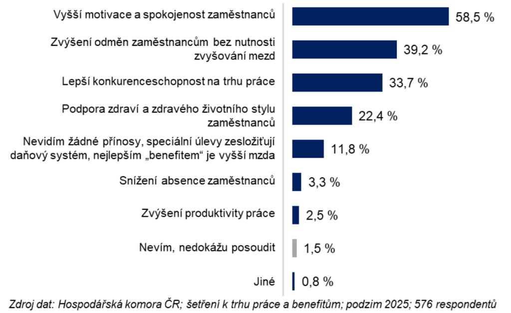 Bezmála dvě pětiny zaměstnavatelů (39,2 %) vnímají benefity jako způsob, jak zvýšit odměny zaměstnanců bez nákladnějšího plošného zvyšování mezd. Pro 33,7 % firem jsou benefity především nástrojem, jak obstát v konkurenčním boji na trhu práce, a to jak při náboru nových zaměstnanců, tak při udržení stávajících. Nemalá část firem (22,4 %) poskytování benefitů rovněž chápe jako prostředek podpory zdraví a zdravého životního stylu svých zaměstnanců.