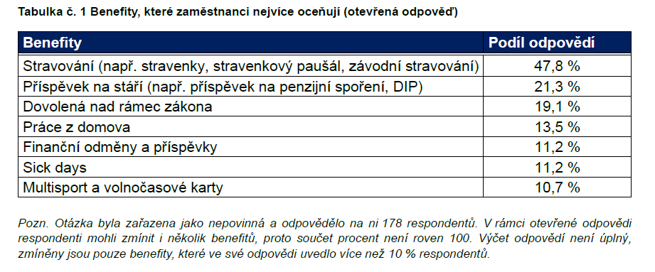 Nejoblíbenější benefity z pohledu zaměstnanců ukazuje otevřená otázka šetření: téměř polovina respondentů (47,8 %) označila za nejoceňovanější benefity v oblasti stravování, dále příspěvek na penzijní spoření (21,3 %) a dovolenou nad rámec zákona (19,1 %). Tyto odpovědi korespondují s nejčastěji poskytovanými benefity: vedle benefitů v oblasti stravování, které poskytuje 87,6 % respondentů, také více než 84 % firem nabízí příspěvek na penzijní připojištění a další sociální benefity.