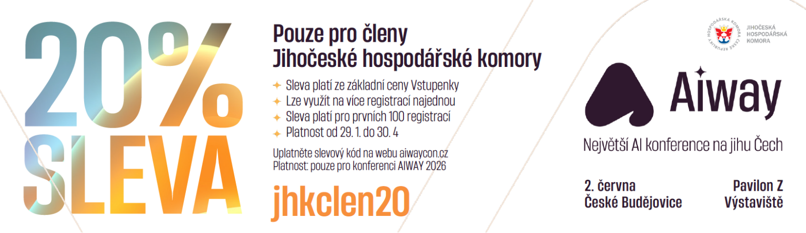 Jako organizátor nabízíme exkluzivní 20% slevu na největší AI konferenci pro firmy a podnikatele na jihu Čech. Konference se koná 2.6. na Českobudějovickém výstavišti v pavilonu Z. Na eventu kromě konkrétních budete moci též konzultovat nasazení AI přímo pro vaši firmu nebo projekt. Detail speakerů a vystoupení naleznete na webu: https://aiwaycon.cz/