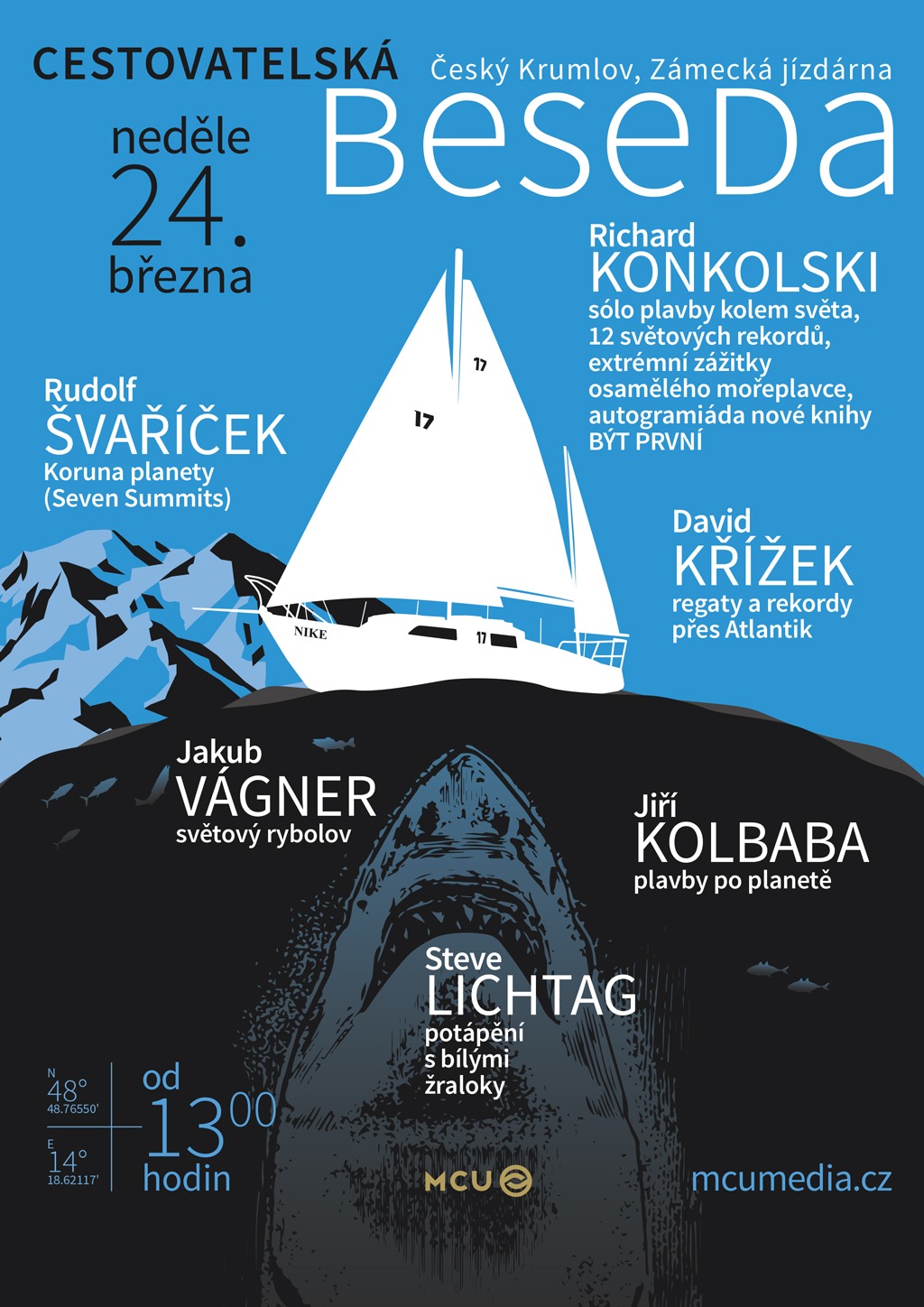 Od 13 hodin pak přivítáme v moderované besedě slavných cestovatelů mořeplavce, potápěče, rybáře, horaly, novináře i fotografy. Jména Rudolf Švaříček, Jiří Kolbaba, Jakub Vágner, David Křížek, Steve Lichtag a Richard Konkolski jsou zárukou prvotřídní kvality. K dispozici bude i LED projekce 10 x 3 m.