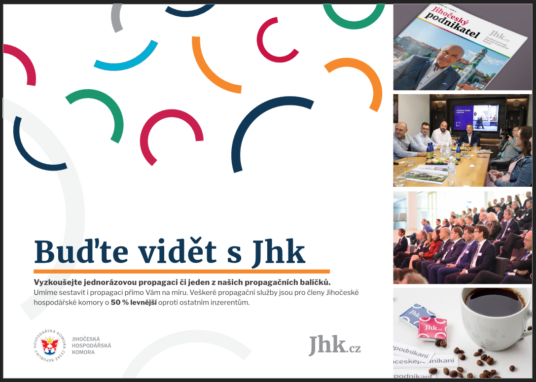 - Tištěná inzerce v časopise Jihočeský podnikatel - 4x do roka, distribuce na více než 1 100 členům Jhk a 800 institucím a zástupcům měst a obcí v regionu